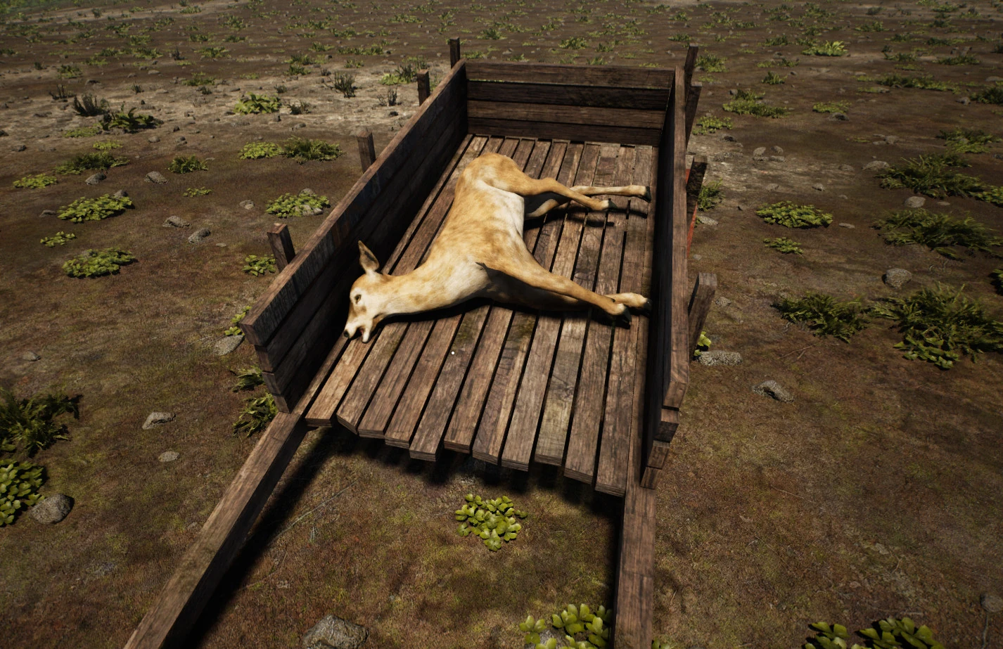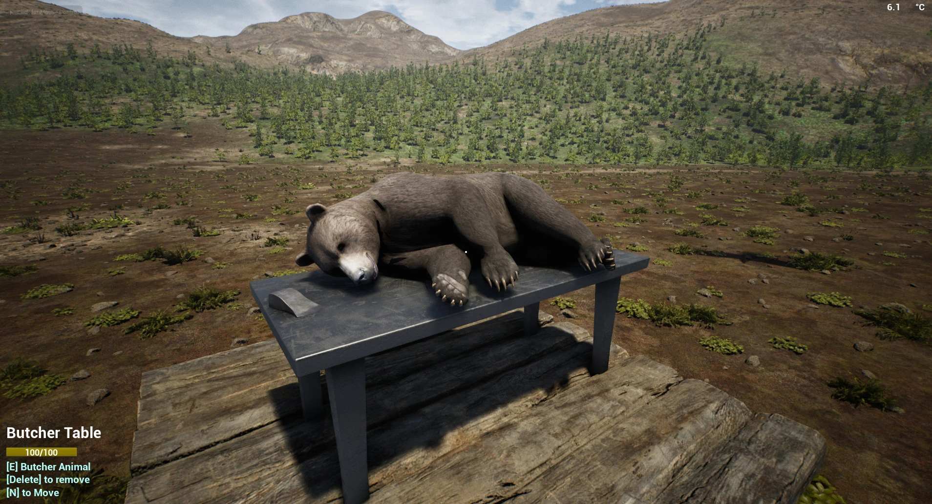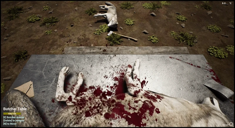 The Butcher Table is a workstation at which the player can butcher Animals to obtain meat and other resources. Carcasses of animals that are killed (with the exception of Birds, Chickens and Scorpions) must be placed on a Butcher Table (default key E) to be butchered. Carrying the carcass of a dead animal will cause the player to be over-encumbered and to walk at a very slow pace. A solution to this inconvenience is to transport the carcass in a Log Cart or the Truck. Only one carcass can be placed in a vehicle at a time. A carcass held by the player can be placed in a vehicle with the E key (default) and removed with