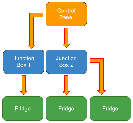 The player can build countless versions of a distributed configuration. This flowchart shows only a very simple version containing only one Control Panel and two Junction Boxes. Assuming that the Fridges are all in the same vicinity, the purpose of connecting one Fridge to Junction Box 1 and the other two Fridges to Junction Box 2 is to allow them to be turned on and off separately. The player may want to save Power by turning off Fridges that are empty by switching off either Junction Box 1 or Junction Box 2 in the user interface of the Control Panel.