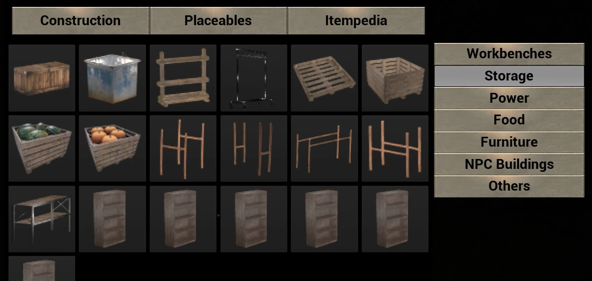 There are several craftable Storage items in the game. Most items can be placed anywhere apart from the NPC Storage Container witch can only be placed inside the NPC buildings.