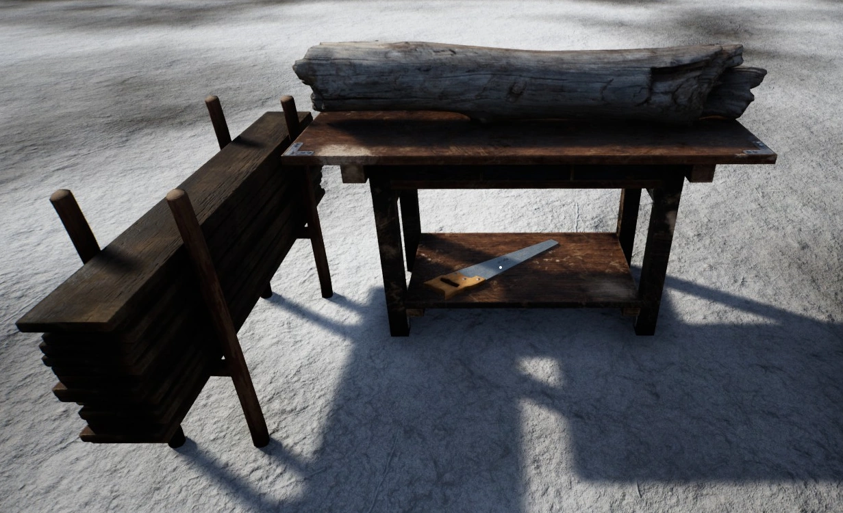 The Sawbench is an early-game workstation used to saw Wood Logs into Planks. Logs must be placed on the Sawbench one at a time for processing. It creates 2 Planks per Wood Log and it can store up to 20 Planks in the integrated plank holder. The Sawbench requires no fuel.